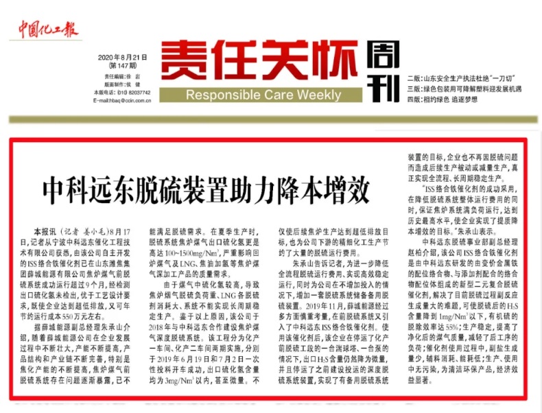 “ISS絡(luò)合鐵催化劑的成功采用,在降低脫硫系統(tǒng)整體運(yùn)行費(fèi)用的同時(shí),保證焦?fàn)t系統(tǒng)滿負(fù)荷運(yùn)行,達(dá)到歷史最高水平,使企業(yè)實(shí)現(xiàn)了提質(zhì)降本增效的目標(biāo)。“朱承山表示。